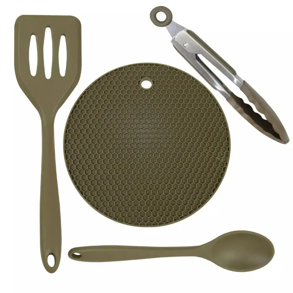 Das Set besteht aus eiener flexiblen Heizmatte zum Schutz vor heißen Oberflächen, auf dem Schoß oder auf der Bodenplane; einer ergonomischen Greifzange mit Verschlussmechanismus; einem Spatel zum Anheben von Lebensmitteln vom Topfboden; und einem Löffel zum Umrühren und zum Servieren. Alle Produkte im Set sind aus 100% Lebensmittelechtem Silikon hergestellt, für zusätzliche Festigkeit und verbesserte Haltbarkeit und sie halten 250 Grad Hitze aus, so dass selbst die Bohnen ohne weiteres aufgegriffen werden können.
